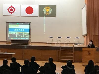 2学期を通して見られた生徒一人一人の「集団、挨拶」の成長、日常の中での小さな挑戦が、大きな力につながっていることについて、お話がありました。生徒たちは、これまでの自分を振り返りながら、これからの学校生活に生かそうと真剣に耳を傾けていました。