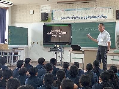 1年生は、再来週の校外学習を一つの柱とした新たな総合的な学習の時間のカリキュラムがスタートしています。その一環として、9月5日(金)は「総合的な学習の時間とは?」という題で、未来を生き抜くために必要な力やその身に付け方について考えました。総合的な学習の時間の学びのキーワードは「探究」と「協働」。教頭先生が例えを用いながら分かりやすく説明し、1年生はうなずきながら真剣にお話を聞きました。今後の活動の中で、多くの「問い」を見つけ、みんなで力を合わせて「答え」を探し出してください。(*^o^*)