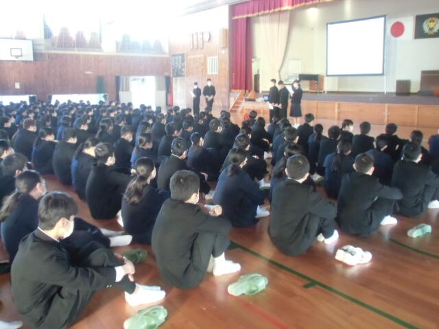 3学期が始まり、もうすぐ1月が終わろうとしています。子どもたちも学校生活に慣れ、授業、部活動に一生懸命取り組んでいます。3年生も卒業まであと2か月を切りました。総合的な学習の時間では、高校入試に向けて面接の練習を頑張っています。いよいよ明日は市立高校の入学試験が行われます。また、2年生は実力テストが行われました。1年生、2年生も3年生の姿をみて1年後2年後の自分たちを見据えて学習に取り組んでほしいものです。1月21日に給食委員会による弁当の日を考える集会が行われました。