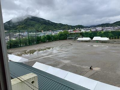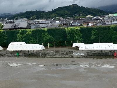 残念ながら、これまでの大雨でグラウンドが水に浸かってしまいました。これから、本日、生徒、職員、PTA役員の力を合わせ、19日の順延に向けて整備を行います。