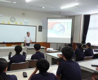 7月10日(木)の3・4校時に、宮崎県環境保全アドバイザーの髙橋伸幸(たかはし・のぶゆき)様を講師としてお迎えし、3年生を対象に環境学習を行いました。