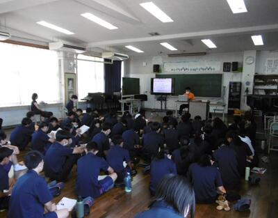 当日は熱中症対策のため、1・2組は多目的室、3・4組は音楽室に分かれて受講しました。