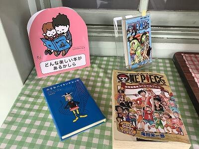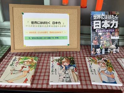 学校図書司書の多田先生からのタイムリーな本の紹介。休み時間等に立ち止まってパラパラとめくる人が続出。今は、「世界にはばたく日本力」というコーナーで、「かくかくしかじか」など、漫画やアニメに関する本が展示中。「あなたはどんな分野で羽ばたきますか?」という問いかけ。本との出会いは偶然であり必然でもある。みなさんに素敵な本との出会いがありますように。