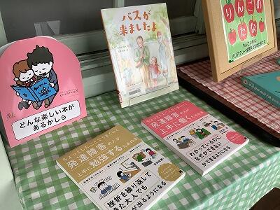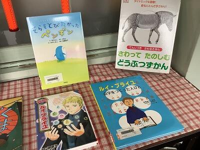 学校図書司書の多田先生が紹介してくださった「りんごのたな」=バリアフリーな資料をあつめた棚が職員室前に登場。「さわれる・まなべる」本。早速犬の毛並みやウミガメの甲羅を触って確かめている生徒たちがいました。
