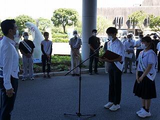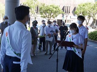 本日、日南市役所前で「社会を明るくする運動(自治会・保護司主催)」の伝達式が行われました。式では市長の前で本校の生徒会長・副会長が堂々と首相メッセージを朗読しました。素晴らしい発表でした。