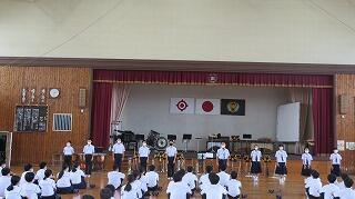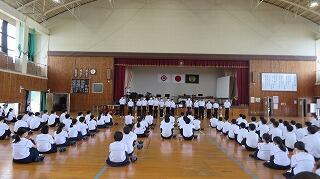 宮崎県中学校総合体育大会及び宮崎県吹奏楽コンクールに向けての壮行式がありました。軟式野球、陸上、女子テニス、男子バスケット、サッカー、剣道、男子テニス、男子卓球、水泳、柔道、バドミントン、弓道、ハンドボール、テニス、空手、吹奏楽の各部です。