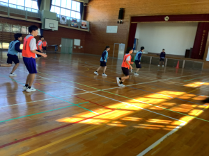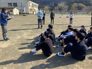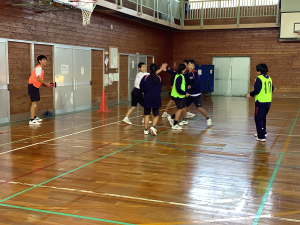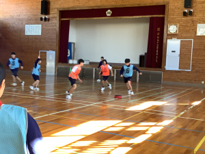 全校体育では、柔らかいディスク型用具を使ったフットサッカーを行いました。男女混合チームでの活動でしたが、全員が意欲的に動き、サイドを使った攻撃など、工夫したプレーが多く見られました。柔らかいディスク型用具はトラップがしやすく、ボールとは違い当たった時に痛みも感じにくいため、サッカーが苦手な生徒も安心して参加することができていました。また、コートが狭いため展開が速くなり、見ていても楽しい活動でした。運動の得意・不得意に関わらず、全員が楽しみながら参加できる全校体育となりました。