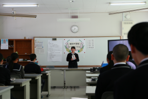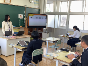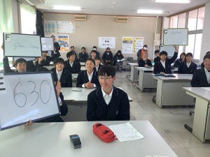 (お)お弁当の大きさ (い)彩りの工夫 (し)主食:主菜:副菜=3:1:2のバランス(そ)それぞれ異なる味付けや調理方法を取り入れること (う)動かないように詰める工夫など、具体的で分かりやすいポイントを教えていただきました。後半は「お弁当クイズ」を行い、生徒たちは楽しみながら学びを深めることができました。