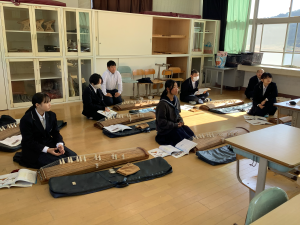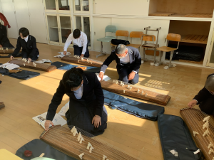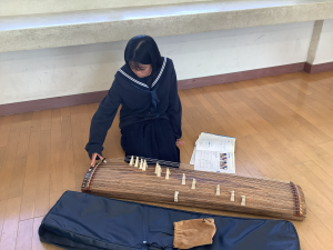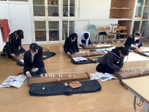 1年生の音楽の授業では、琴で「さくら」を弾く練習に取り組んでいます。初めて触れる琴に興味をもち、音の出し方や弦の押さえ方を確かめながら、丁寧に演奏する姿が見られました。琴のもつ独特の音色に日本の伝統音楽の良さを感じながら、最後は高音と低音に分かれて演奏し、教室に美しい音色を響かせていました。