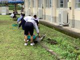 本事業に際して、本校第13回卒業生同窓会からの寄付金を活用させていただきました。この場を借りてご報告とお礼を申し上げます。地域の方々、小学生、保護者、生徒、教職員等、多くの方がご参加くださいました。主な作業内容は①テニスコートの整備②古いラインテープの分別③体育大会入退場門の支柱穴の掘削④走り幅跳び砂場の整備⑤心が温かくなるホット豚汁