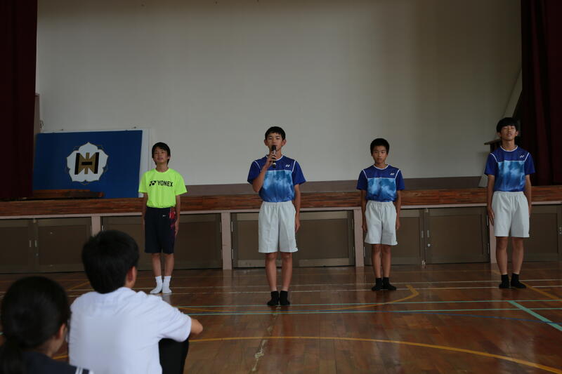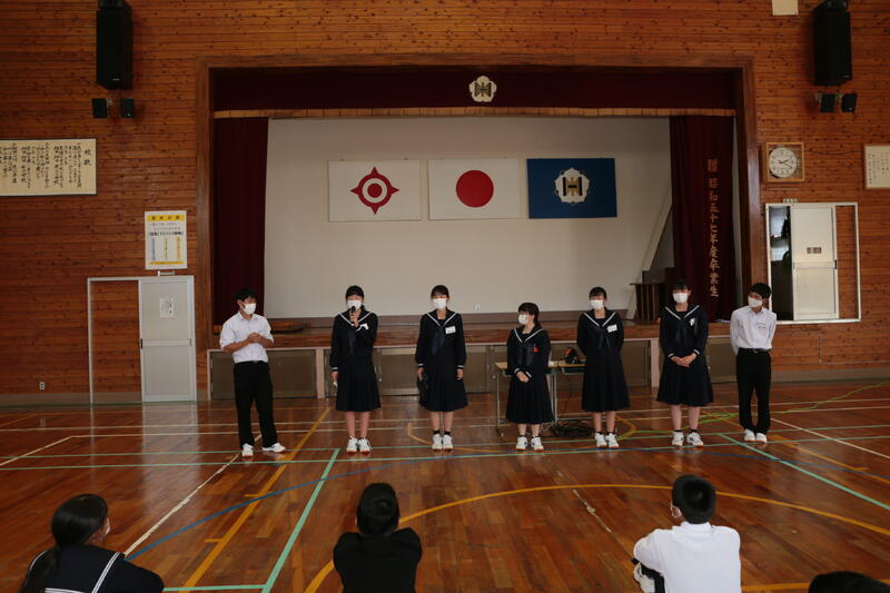 敢闘賞表彰(敢闘賞とは?持久走の準備期間に頑張っていたと思う人を投票してきました。その中で投票数を集めた生徒の表彰です。もちろん全員1票以上投票されていました。互いを認め合う細中生!)