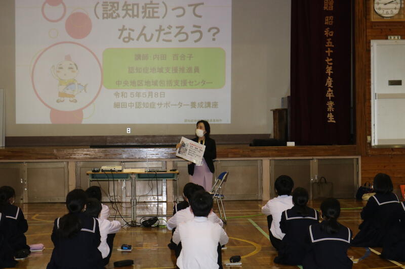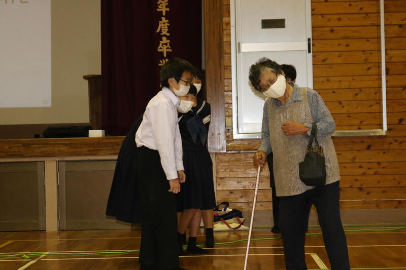 認知症の知識、認知症の方への接し方の基本のお話がありましたが、これは、誰に対しても同じで、相手を理解して行動するということにつながります。学年を越えた縦割りのグループで、説明を聞いたり、動画を視聴したりしながら、課題や具体的な接し方を話し合いました。認知症役の先生に対して、グループで話し合った「答え」で対応してみましたがなかなか難しいようでした。これもまた、一つの挑戦です。