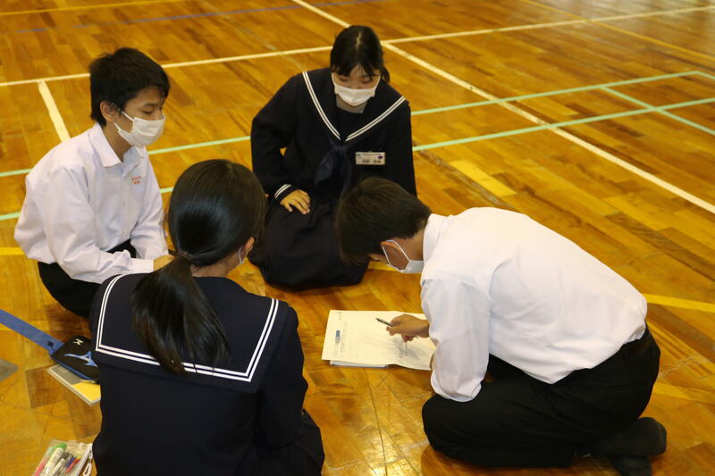 ワークショップでは、生徒2チーム大人1チームに分かれ、チーム対抗戦のルールを考えました。目標は、車いすを使用している官野さんがいるチームを含めた全チーム全員が全力を出し切り、同タイムでゴールできること。様々な意見を出し合い、ルールを創り出しました。