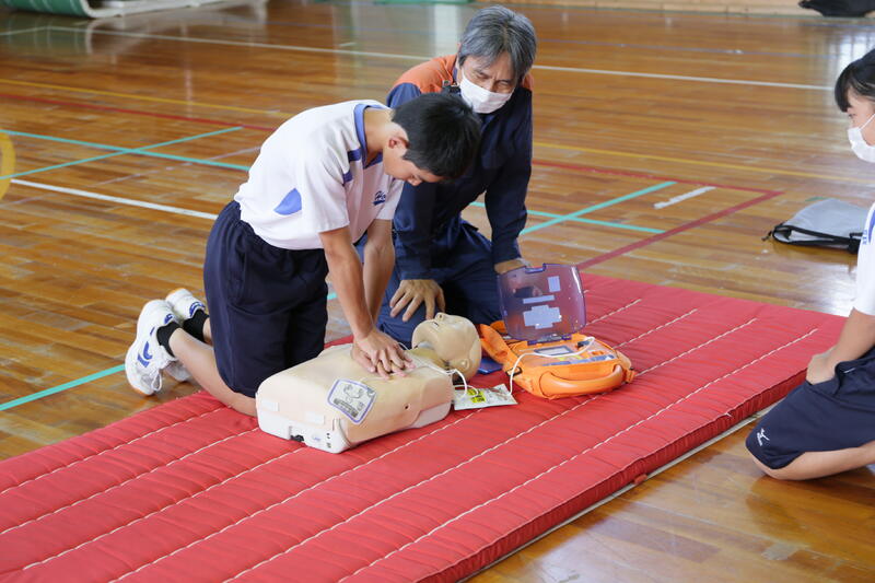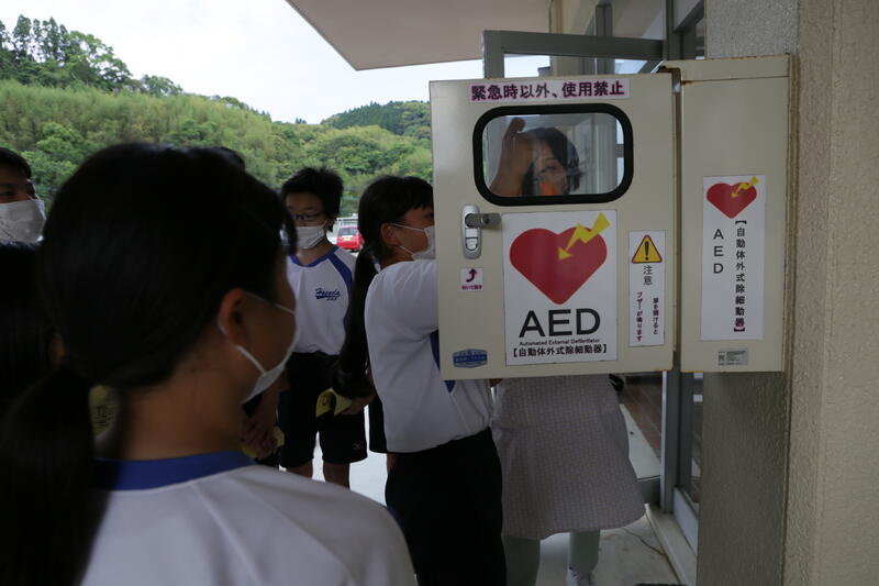 講習会では説明の後、4つのグループに分かれ、交代で胸骨圧迫(心臓マッサージ)やAEDの取扱いなど、非常時の応急手当について学びました。上学年の生徒は2回目の講習になる生徒もいて、前回の学習を思い出しながら、真剣な表情で講習に参加していました。講習会後には、校内のAED設置箇所に行き、実際にAEDの設置箱を開けてブザーの音を聞いたりして、扱う際の注意点などを学びました。