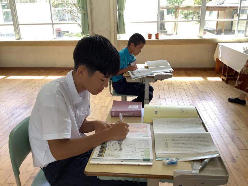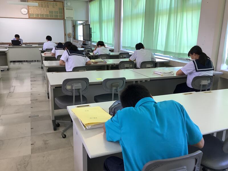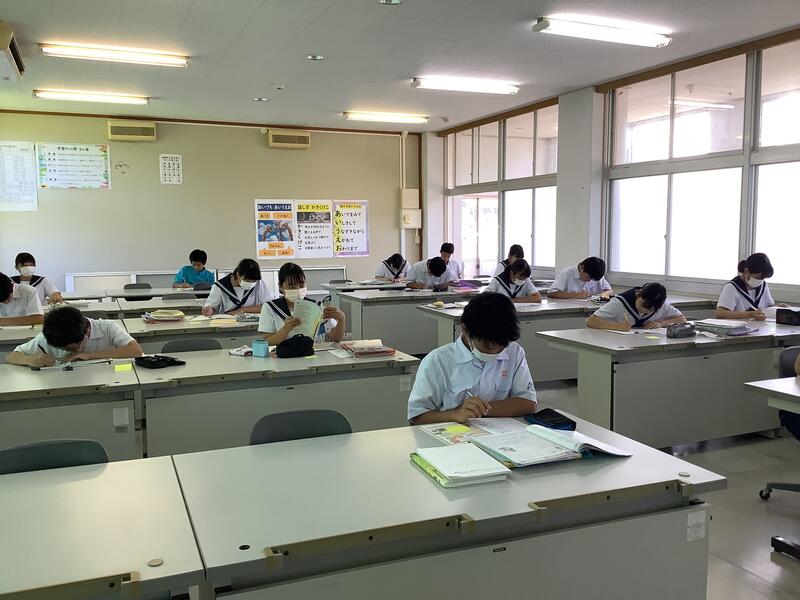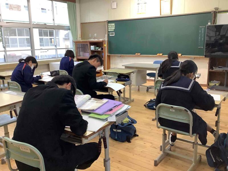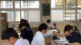 放課後。遠くからテニスコートから「ファイトー!」の声が聞こえています。その頃3年生の教室では、受験生が、自主的に黙々と勉強に取り組んでいます。頑張れ3年生!目標に向かう姿が頼もしい。