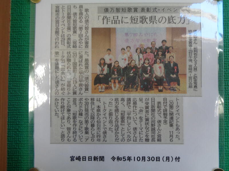 日頃から、新聞などの文章を読み、意見や感想、気づきや思い出等を文に表わし続けている皆さんの活動を評価していただいたと感じています。現在、職員室前に、表彰式で頂戴したものを飾っております。宮崎日日新聞社、宮崎日日新聞宮日会、同販売所長会の皆様、ありがとうございました。