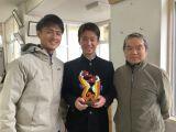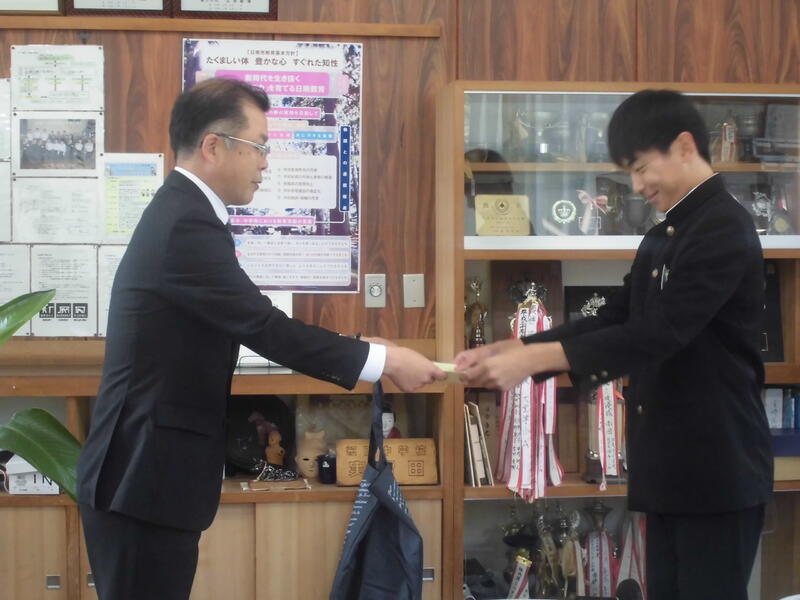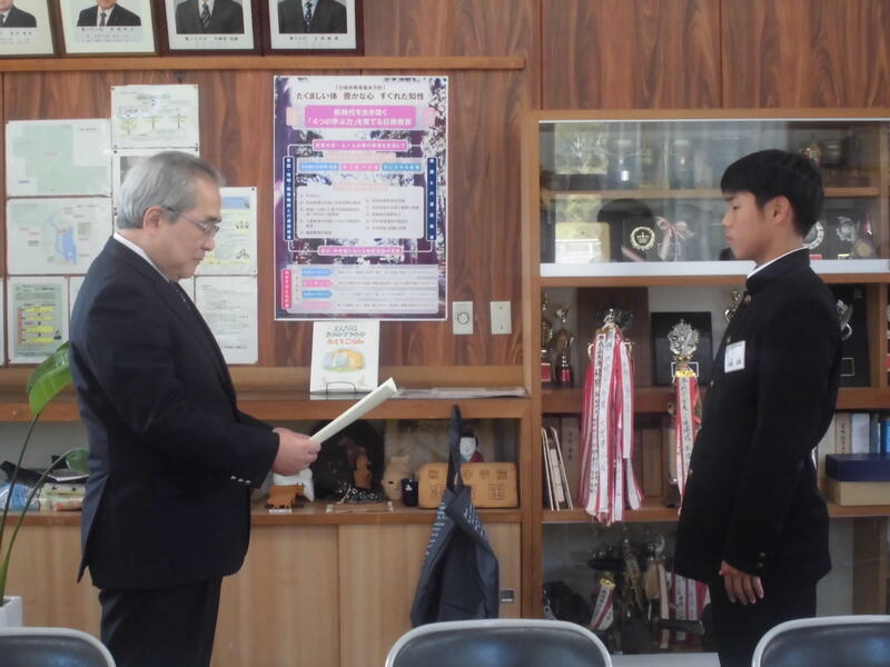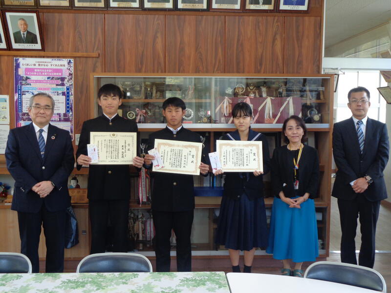日南串間地区租税教育推進協議会会長の日南市教育委員会都甲教育長、日南税務署の中山署長、租税教室でご指導いただいた浜砂さんが本校にお見えになり、校長室で表彰式がありました。受賞者は次の4名です。