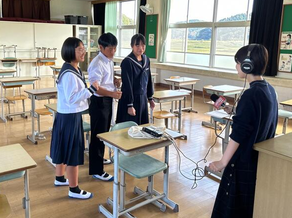 先日、標記ラジオ番組の取材がありました。県内103校目だそうです。インタビューを受けたのは3年生の学級委員と学級担任。アナウンサーと生徒とのやりとりが絶妙で大爆笑の嵐でした。どのように編集されるのか楽しみです。細田中学校や校歌の自慢、学校の様子など、生徒たちや先生の生の声が放送される予定です。写真はインタビューの最後にキャッチフレーズを録音している様子です。テイク3あたりです。
