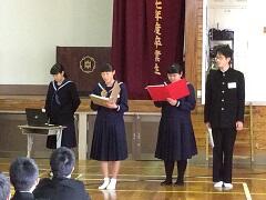 2月4日(金)の全校集会の中で表彰を行いました。今回の表彰は、海保図画コンクールで宮崎海上保安部長賞を受賞した2年生の松﨑百花さんと南那珂地区数学部会主催の計算力コンテストの優秀者、最優秀者への表彰でした。計算力コンテストは代表への表彰を行いました。