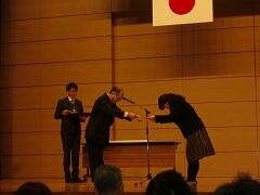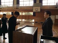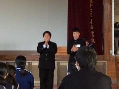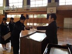 2月4日(金)の全校集会の中で表彰を行いました。今回の表彰は、海保図画コンクールで宮崎海上保安部長賞を受賞した2年生の松﨑百花さんと南那珂地区数学部会主催の計算力コンテストの優秀者、最優秀者への表彰でした。計算力コンテストは代表への表彰を行いました。