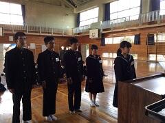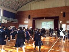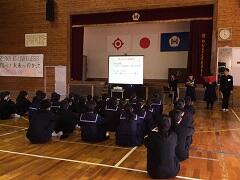 2月2日(金)に生徒会集会を行いました。はじめに各専門委員長から1月の活動の反省と2月の活動について報告がありました。続いて、今回の担当の保体委員会が、インフルエンザにかからないためのプレゼンをしてくれました。手の洗い方、うがいの仕方、マスクの付け方など丁寧に説明してくれました。最後はみんなで健康体操をしました。