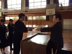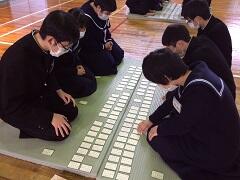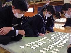 3月2日(金)に生徒会集会を実施しました。はじめに各全校専門委員長から2月の活動についての反省と3月の活動の説明がありました。その後は、今回担当である学習文化委員会の企画で全校百人一首(源平合戦)大会が行われました。この大会は全校生徒が3人~4人のグループを16組作り、百人一首で対戦していくものです。中には、百人一首が得意で上の句が呼ばれると、即座に反応する生徒もいましたが、ほとんどの生徒は、下の句まで読まれてから一生懸命に札を探していました。とても良い企画でした。学習文化委員会のみなさん、ご苦労様でした。