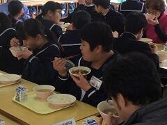 2月22日(木)の給食時間に地産地消交流給食を実施しました。今日の給食のメニューであるマグロの生産者である大堂津漁港や漁協女性部、また市役所の水産林政課、市教委なども来られ、賑やかな給食になりました。生産者からはマグロの種類やマグロの捕り方などを教えていただきました。生産者や市の関係者、栄養教諭の河野通子先生との交流給食は楽しい、有意義な時間になったと思います。