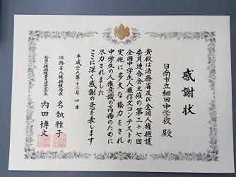 12月19日(火)に日南人権擁護委員協議会 会長 佐藤幸一様をはじめ宮崎地方法務局日南支局や人権擁護委員の方が来校され、本年度の人権作文の表彰式を実施されました。2年生の松﨑百花さんが人権擁護委員協議会奨励賞を、また学校が学校賞を受賞しました。これからも人権教育に力をいれて取り組んでいきたいと改めて思いました。