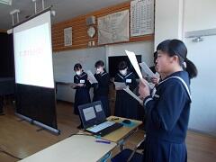1月19日(金)に給食感謝週間にあわせて「食に関する集会」を実施しました。生徒会の保体委員会の担当班が企画・準備をして実施してくれました。当日の内容は「食に関するクイズ」「給食ができるまでの映像」「私が考える給食メニュー」の優秀作品の発表を行いました。細田地区栄養教諭の河野通子先生との打ち合わせやアドバイスをいただきながら準備を進めてきました。素晴らしい集会になりました。