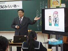 宮崎県記紀編纂1300年記念事業の出前授業「記紀みらい塾」が11月30日(木)に本校1年生を対象に開催されました。今年度、宮崎県内では第7回目になります。古代文学を研究する県立看護大学の大館真晴准教授による神話についての講義をしていただきました。2時間ほどの話でしたが、海彦山彦の話など楽しくおもしろく話してくださいました。生徒が調べた細田地区の神社のことと神様の由来などとても興味深い内容でした。