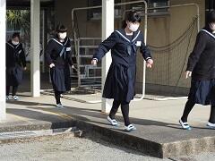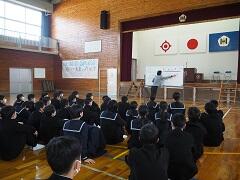 1月16日(火)の6校時に火災を想定した避難訓練を実施しました。理科室から火災が発生したとの想定で、全員が運動場へ避難しました。今回は日南消防署や興南防災の方に来ていただき、講話や消火訓練もあわせて行いました。避難では3年生の1名が逃げ遅れたとの想定で、何も知らされてない3年生の対応を観察しました。これからも様々な場面を想定しながら、万が一の時の対応力を身に付けさせていきたいと考えています。