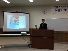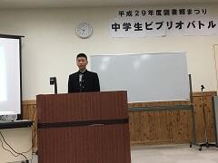 11月18日(土)に日南市立図書館まつりInまなびピアが開催されました。その中の【中学生によるビブリオバトル】に細田中学校代表として3年生の﨑村瑛登君が出場しました。﨑村君はドリアン助川さんが書いた「あん」という小説を紹介しました。すべて暗記した内容を体いっぱいに表現していました。残念ながら最優秀は逃してしまいましたが、素晴らしい発表でした。﨑村君、お疲れ様でした。