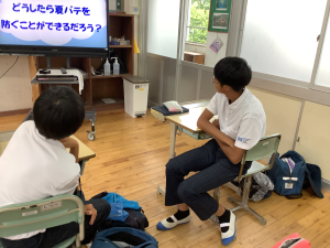 日南市中央調理場より講師の先生をお招きし、「暑さに負けない体づくり ~夏バテを防ぐための食事と生活習慣~」についてお話をしていただきました。講話の中では、夏バテを防ぐためのポイントとして、次のことを教えていただきました。「主食・主菜・副菜をそろえて、バランスよく食べるようにしましょう。」「一日のエネルギー源となる朝食は、暑さに負けない体の土台になります。」
