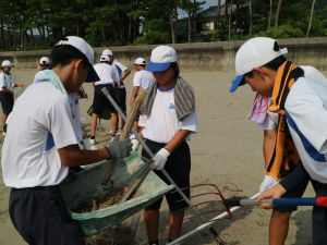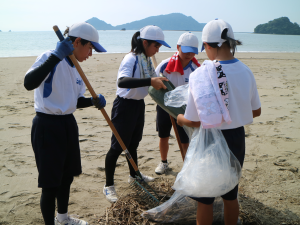 日曜日には、多くの生徒が大堂津海水浴場の清掃ボランティアに参加してくれました。地元の海をきれいにする活動を通して、自分たちにできる身近な環境づくりに取り組むことは、とても意義のあることです。暑い中での活動となりましたが、海水浴場の方がキッチンカーでかき氷や飲み物を無料でふるまってくださり、生徒たちも笑顔で活動を終えることができました。今後も、地域とつながりながら、自分たちにできることを実践していく力を育んでいきたいと思います。