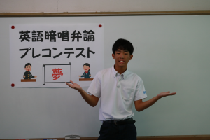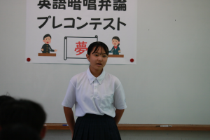 英語暗唱のプレコンテストを行いました。コンテストには、希望者の1年生から3年生の多くの人がチャレンジし、全校生徒の前で堂々と発表することができました。人前での発表は緊張を伴うものですが、目標をもって挑戦することは、自分自身の成長につながる貴重な経験となります。