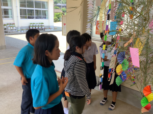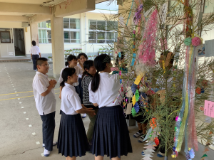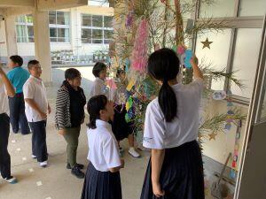日南地区更生保護女性会の方が七夕に向けて笹の準備をしてくださいました。(毎年、ありがとうございます。)その笹に付けられた色とりどりの短冊には、「秋季大会で優勝したい」「志望校絶対合格」など、それぞれの夢や願いが込められています。織姫と彦星の飾りも加わり、校内が美しい七夕ムードに包まれました。天の川に輝く星々に、生徒たちの願いが届き叶うことを心から願っています。