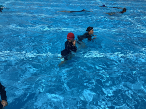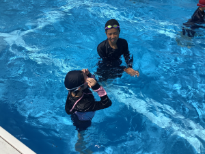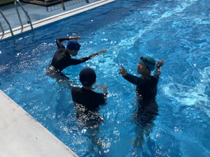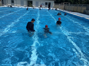 本日の体育では、全学年で水泳の授業を行いました。グループを作り、先輩が苦手な生徒に優しく教える姿が印象的でした。回を重ねるごとにフォームが美しくなり、長く泳げるようになってきています。一度泳ぎ方を身につけると、大人になってもその力は残ります。特に、クロールも平泳ぎも息継ぎをタイミングよく行うことが長く泳ぐコツです。今後も練習を重ねて、できるようになってほしいと思います。