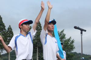 選手を代表して男子ソフトテニス部の主将が「宣誓、我々選手一同は、日頃から仲間とともに、雨の日や風の日、夏の暑い日にも一緒になって汗を流し、声を出して一生懸命練習してきました。今までの練習の成果を発揮し、日々ご指導いただいている顧問の先生方や応援してくださる家族への感謝の気持ちを忘れず、今まで支えてくださった方々に感動してもらえるような姿を見せられるよう全力でプレーしていきます。チーム一丸となり、仲間を信じ、細田中学校の誇りである活気、そして戦う気持ちを最後の最後まで出し切り、全力を尽くすことをここに誓います。」と力強く宣言してくれました。