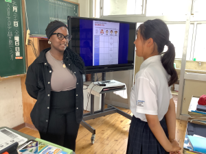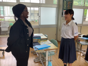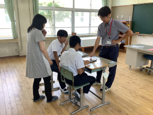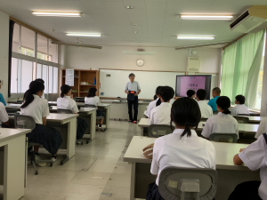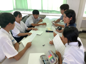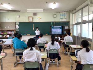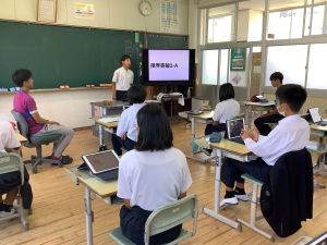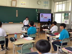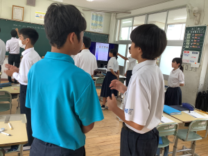 英語の授業にALT(外国語指導助手)の先生が来校され、楽しく実践的な英語の学習活動が行われました。授業の冒頭では、ALTの先生が「What are you going to do this weekend?(週末に何をする予定ですか?)」と問いかけるコミュニケーション活動が行われ、生徒たちはペアで質問したり答えたりしながら、積極的に英語での会話に取り組みました。「I'm going to play tennis.(テニスをするつもりです)」「I'm going to play a game.(ゲームをする予定です)」など、それぞれが自分の週末の予定について英語で表現し、少し緊張しながらも一生懸命に会話を楽しむ姿が見られました。