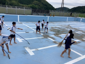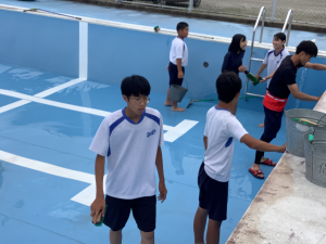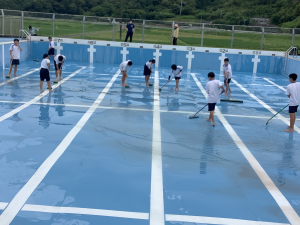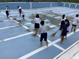全校生徒でプール掃除を実施しました。冬の間に底にたまった土や落ち葉を掃いて取り除き、壁面や底を念入りに清掃しました。最初は泥だらけで茶色く濁っていたプールが、生徒たちの懸命な作業により、見違えるほど美しく清潔なプールに生まれ変わりました。これから始まるプール授業において事故や怪我なく安全に水泳学習に取り組めるよう、みんなで環境を整えることができました。