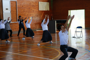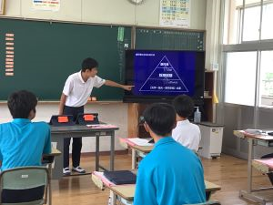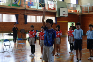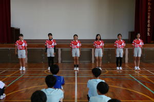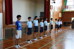 今週末に行われる南那珂地区中学校総合体育大会に向けて、激励式を行いました。男女ソフトテニス部の選手たちが、大会に向けての抱負を発表しました。