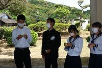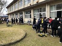 3年生がお世話になった地域へのお礼の気持ちを込めて、大堂津浜周辺(大堂津駅、大堂津浜、漁港)の清掃を行いました。皆、黙々とゴミを拾っていました。掃除が終わると、大堂津浜で級友への感謝の気持ちを伝え合っていました。