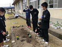 先日、全校生徒で花を花壇に植えた後に、残った花を分担して学校のあちらこちらに植えました。花があると心が落ち着きます。寒さに負けないパンジーやビオラそしてペチュニア・・・本当にたくましいです。運動場では、今度、大堂津浜で実施される立志式の練習を2年生がやっていました。これまた、寒さに負けない元気な姿でした。