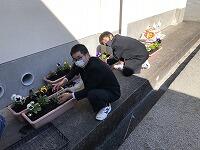 昨日の昼休み、玄関に花を飾ろうと教頭先生と二人の生徒がプランターに花を植えてくれました。