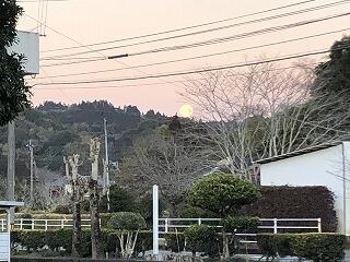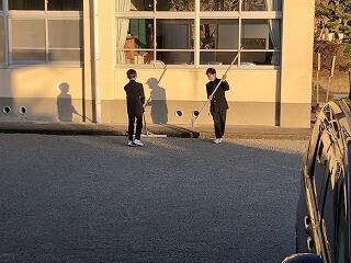 学校からの月です。そして、いつものように玄関前を整地する生徒たち。