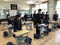今日は、地震・津波を想定した避難訓練を行いました。自転車通生は自転車で、徒歩通生は先生と一緒に走って、細田小学校まで避難しました。細田小学校グランド上の避難場所で人員確認を終えたのが、避難開始12分後でした。どれだけ実際の場面を想定して動けるかが課題でしたが、生徒たちは全員しっかりと取り組んでいました。