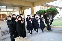 今日の朝自習の直前、突然3年生が2年生から渡り廊下に呼び出されました。何をするのかと思えば、明日からの県立高校一般入試に向けてのエールを1年生とともに送りました。突然のサプライズに3年生も嬉しそうでした。