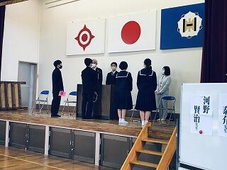 先週の金曜日は、3年生送別行事と校内球技大会がありました。送別行事では、1・2年生は3年生に向けて、3年生は下級生に向けてのメッセージを歌や劇、ダンスなどで表現しました。また、その後の球技大会では、バレーボールを行い優勝チームは教員チームと試合をしました。生徒チームは先生チームにこてんぱんにやっつけられました。