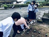 学級の花壇では、先日植えた花に水をやる生徒たちがいました。