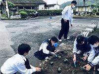 先週の金曜日の昼休み。直前にお手伝いの募集をしたところ、生徒総会や学級設営など忙しい中、10名近くの生徒が駆けつけてくれました。苗を植えている途中、通りかかった方が植え方、肥料の巻き方、苗の扱い方など丁寧に教えてくださいました。とても勉強になりました。